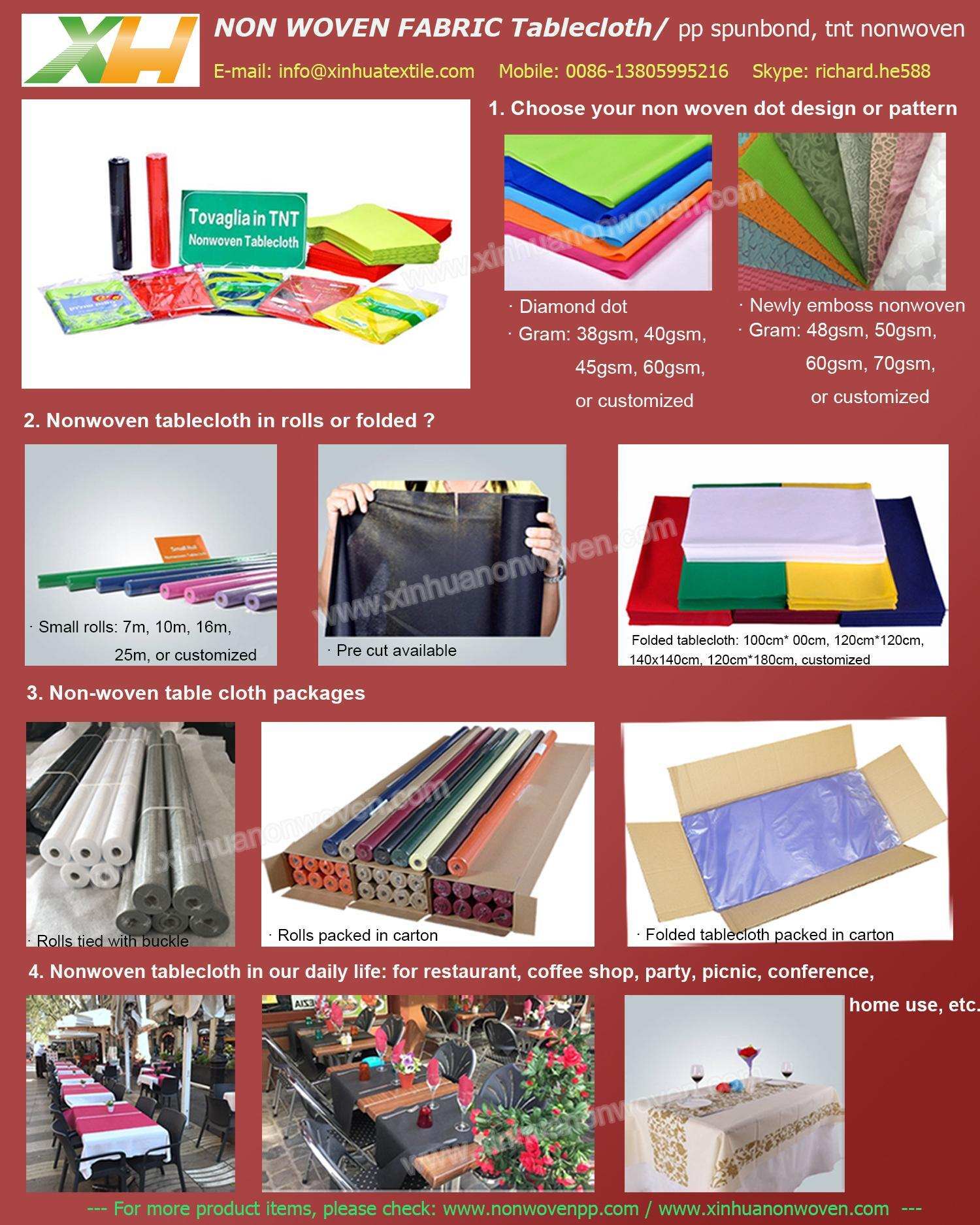 Toalha de mesa TNT/ Capa de mesa não tecida/ Caminho de mesa não tecido/ Jogos americanos não tecidos/ Lençóis de mesa/ Rolos de mesa não tecidos