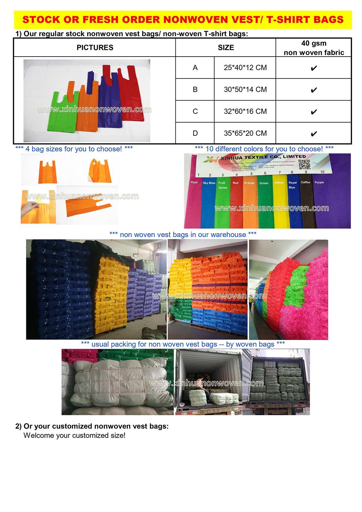 Atualmente, nossa fábrica, XINHUA TEXTILE, pode fornecer e produzir.sacola de camiseta não tecida em várias cores.