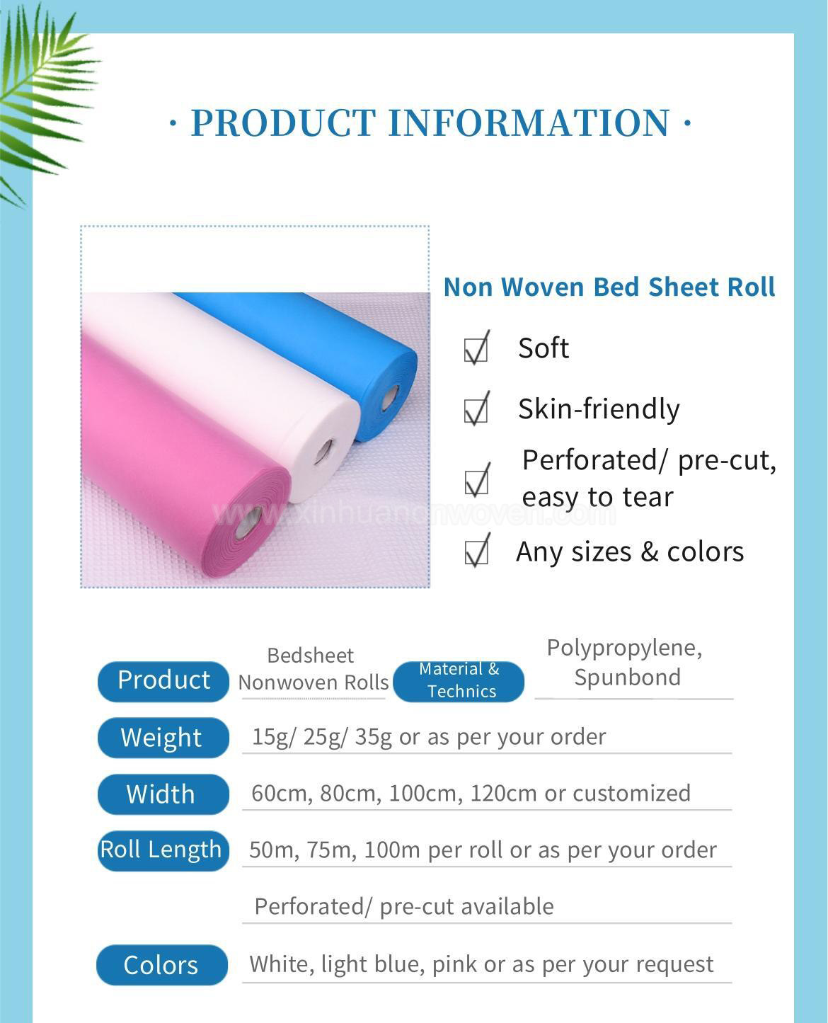 Atualmente, nossa fábrica, XINHUA TEXTILE, pode fornecer e produzir.lençol de tecido não tecido Em diversos pesos, tamanhos e cores.